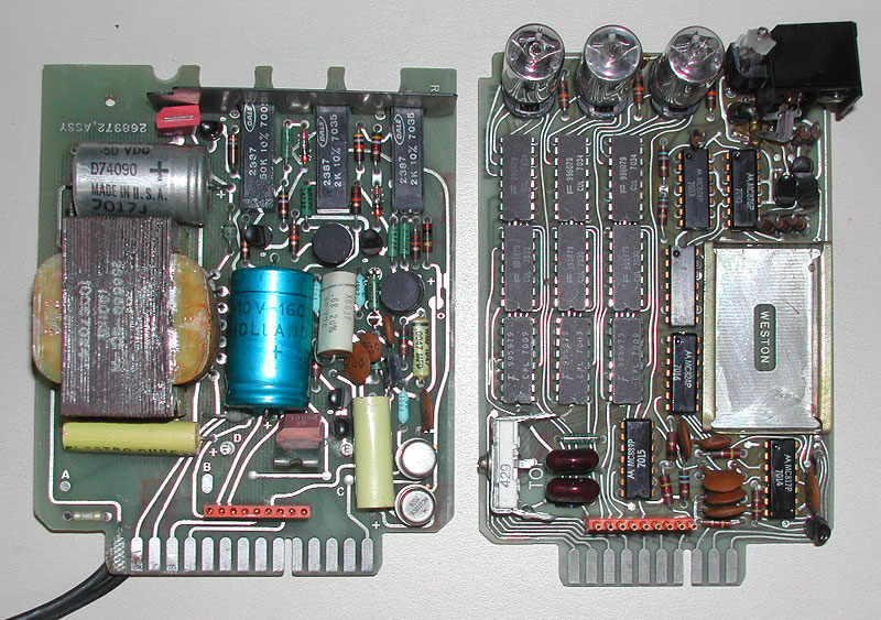I, for my part, found me a broken Digital Panel Voltmeter module which I repaired and converted to a digital thermometer for my den, shown below. Now I can enjoy the glow from a past century whenever I want. This photo shows the device’s innards -– two boards crammed with SSI chips for a functionality that would fit in a single LSI chip today (and a power supply, complete with a 110V line transformer, to feed them all!)