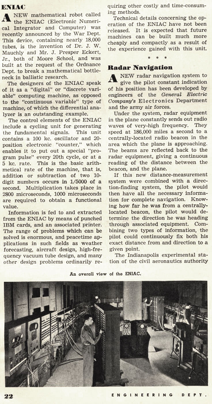 The modest half-page item reports a “New mathematical robot” recently announced by the War Dept. This device, containing nearly 18,000 tubes, is a “digital” or “discrete variable” computing machine, as opposed to the “continuous variable” type. The “basic arithmetical rate of the machine” is 5kHz (in today’s terminology: the CPU runs at a clock frequency of 0.000005 GHz). This “robot” was none other than the Electronic Numerical Integrator and Computer (ENIAC for short), known (not without some controversy) as the first general-purpose electronic computer…