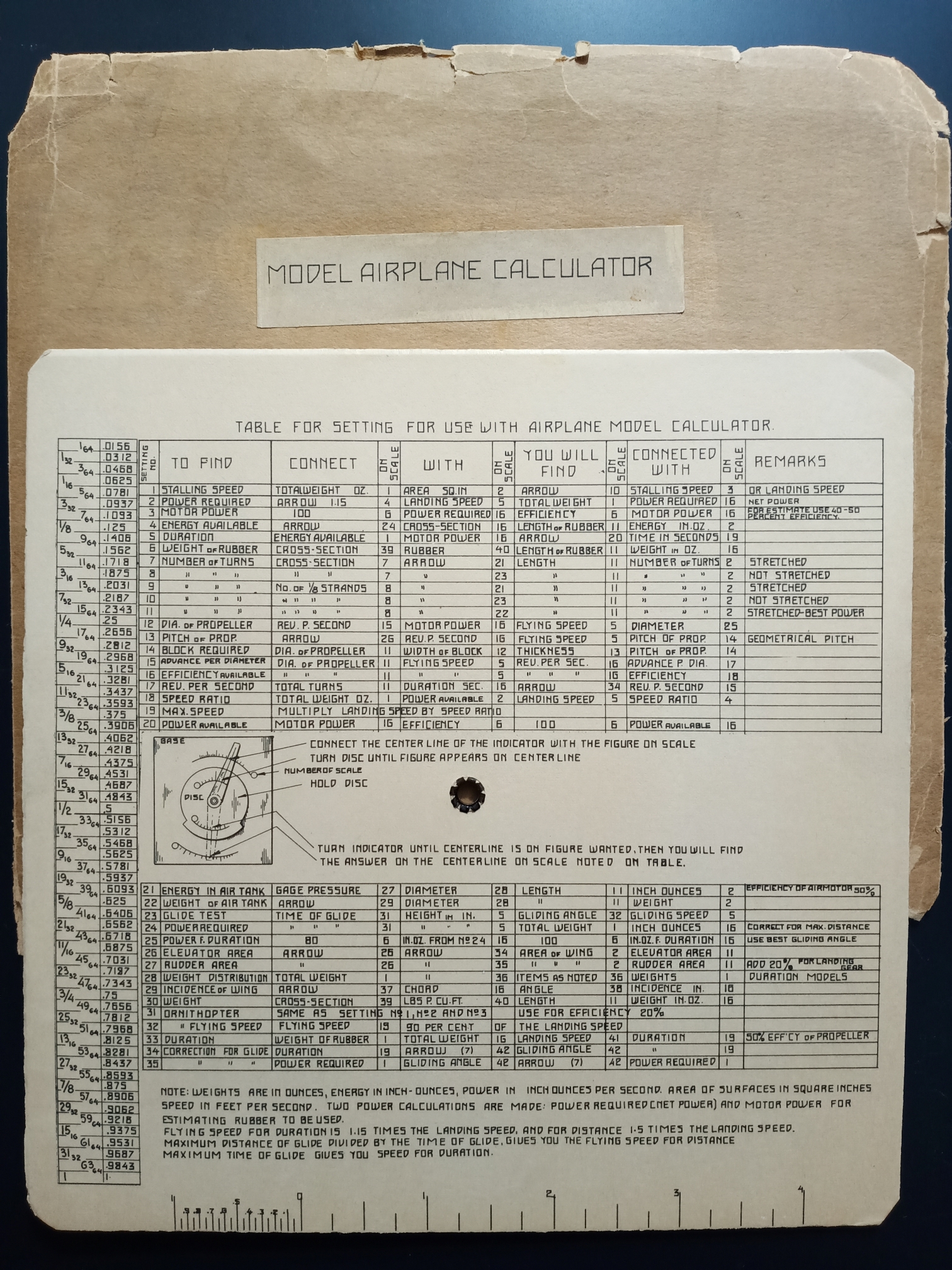 Hoffman’s calculator consists of two parts bound in a rigid folding cover: a circular slide rule , and an instruction booklet that contains, besides the instructions for use, four pages of charts that facilitate calculation of horsepower and of gliding angle for various wing configurations.